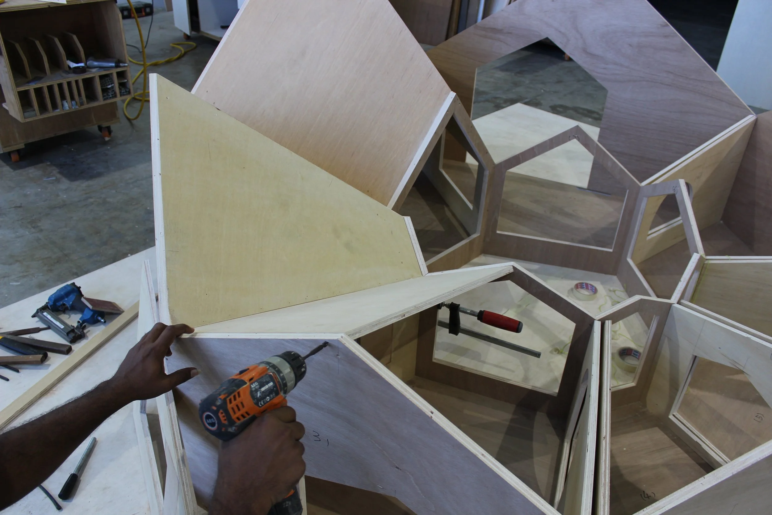 The terrace of detachable individual doghouses for different sized dogs set around a community drinking bowl was inspired by Quentin Tarantino’s heist movie of the same name. This “feature length” doghouse incorporates many motifs that have become Tarantino’s hallmarks: dog friendly, a little breeding, pop culture colour references, lots of naughty woofing, and the potential for fun nonlinear doggy story telling around the reservoir.