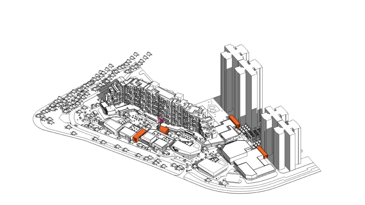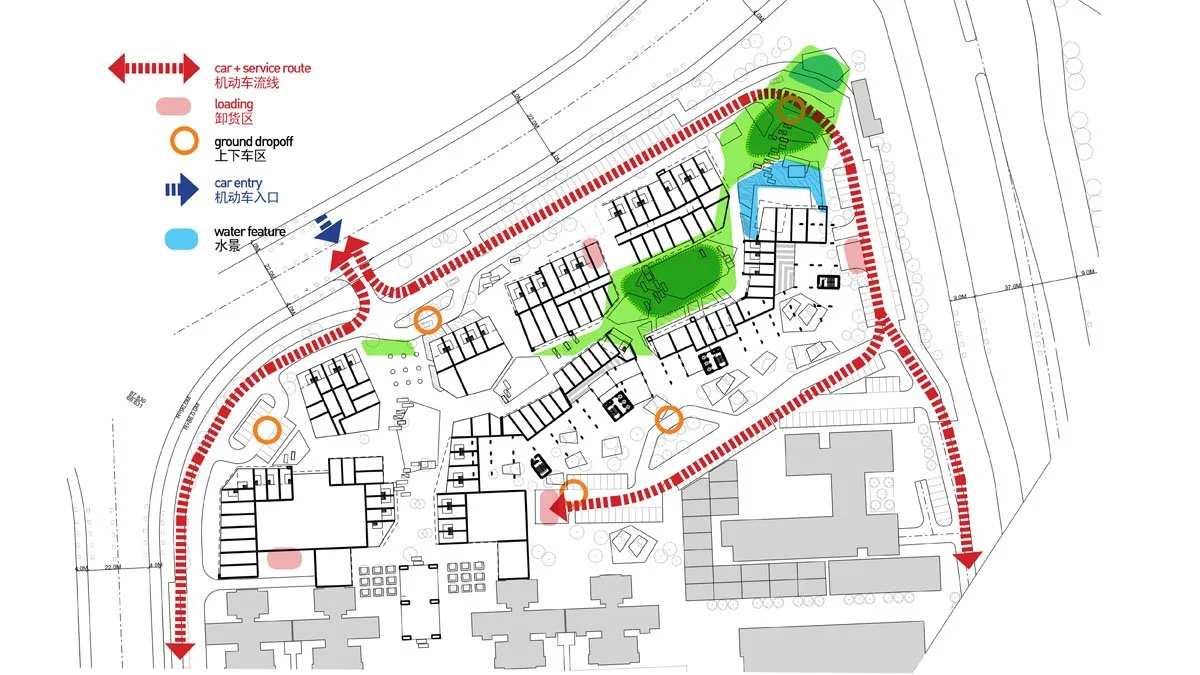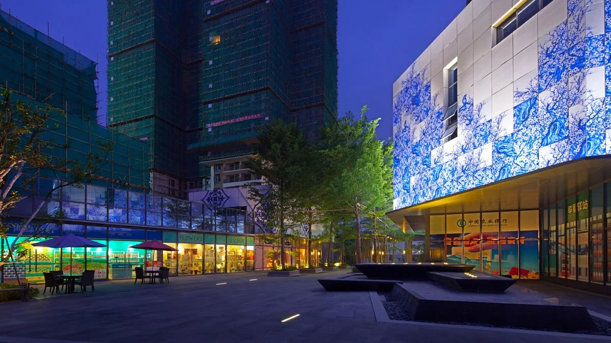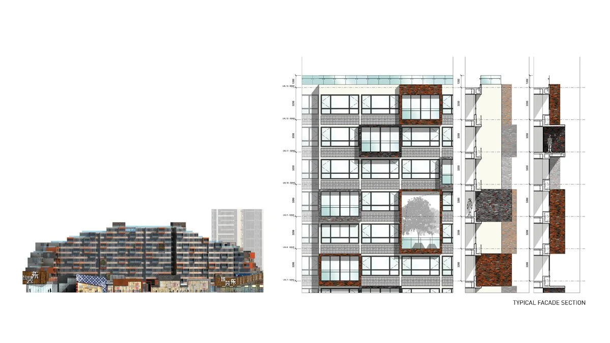 The project at Donghuicheng retail street is part of a much larger residential development that services recent office developments around the new Science Town of eastern Guangzhou. Comprising 31,000 sqm of retail, SOHO and public facilities, Spark’s scheme “The Urban Village” embodies the client’s ambition to establish a new benchmark for “modern Chinese living” with an emphasis on quality and heritage. The retail components are arranged in a village-like configuration, allowing visitors to meander through the intimately-scaled streets and squares. Influenced by traditional Chinese screens, inserted box canopies in the landscape frame views of courtyards as you walk through the streets. The box language extends to the SOHO building as pop-out balconies creating a three-dimensional hillside backdrop. Traditional Chinese building materials such as brick and willow pattern ceramics are used throughout the scheme generating a palette and mix of east and west, old and new.
