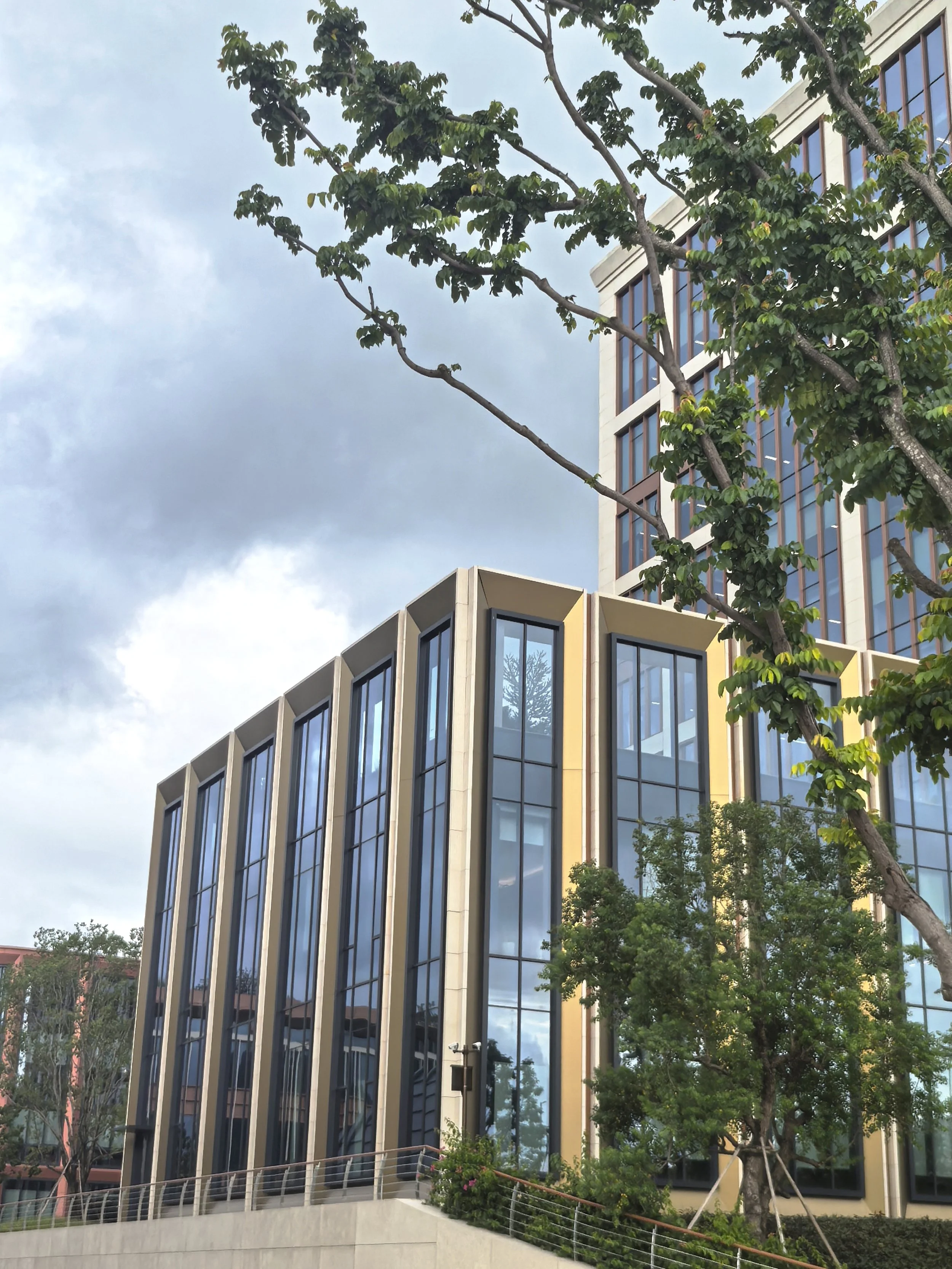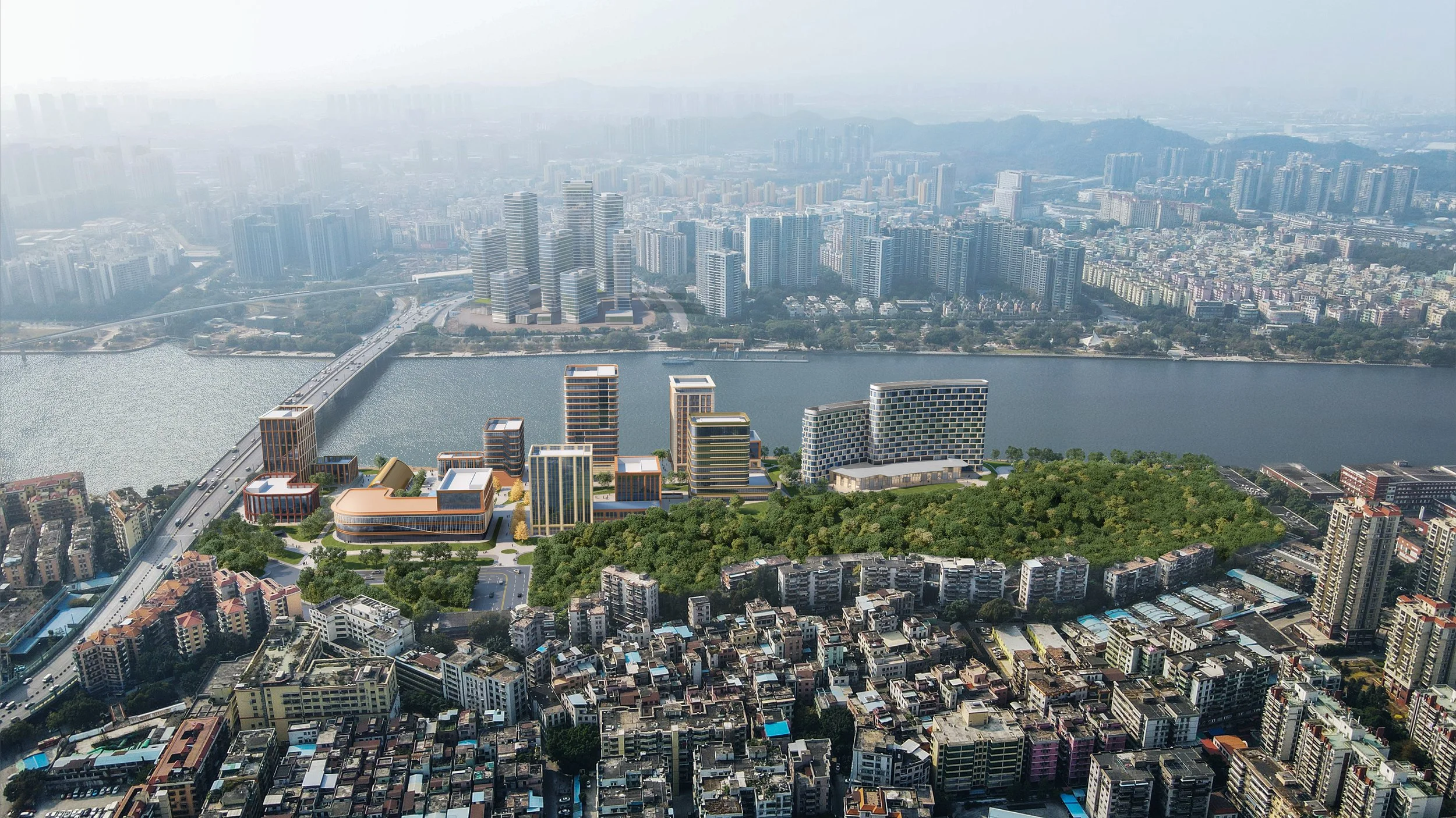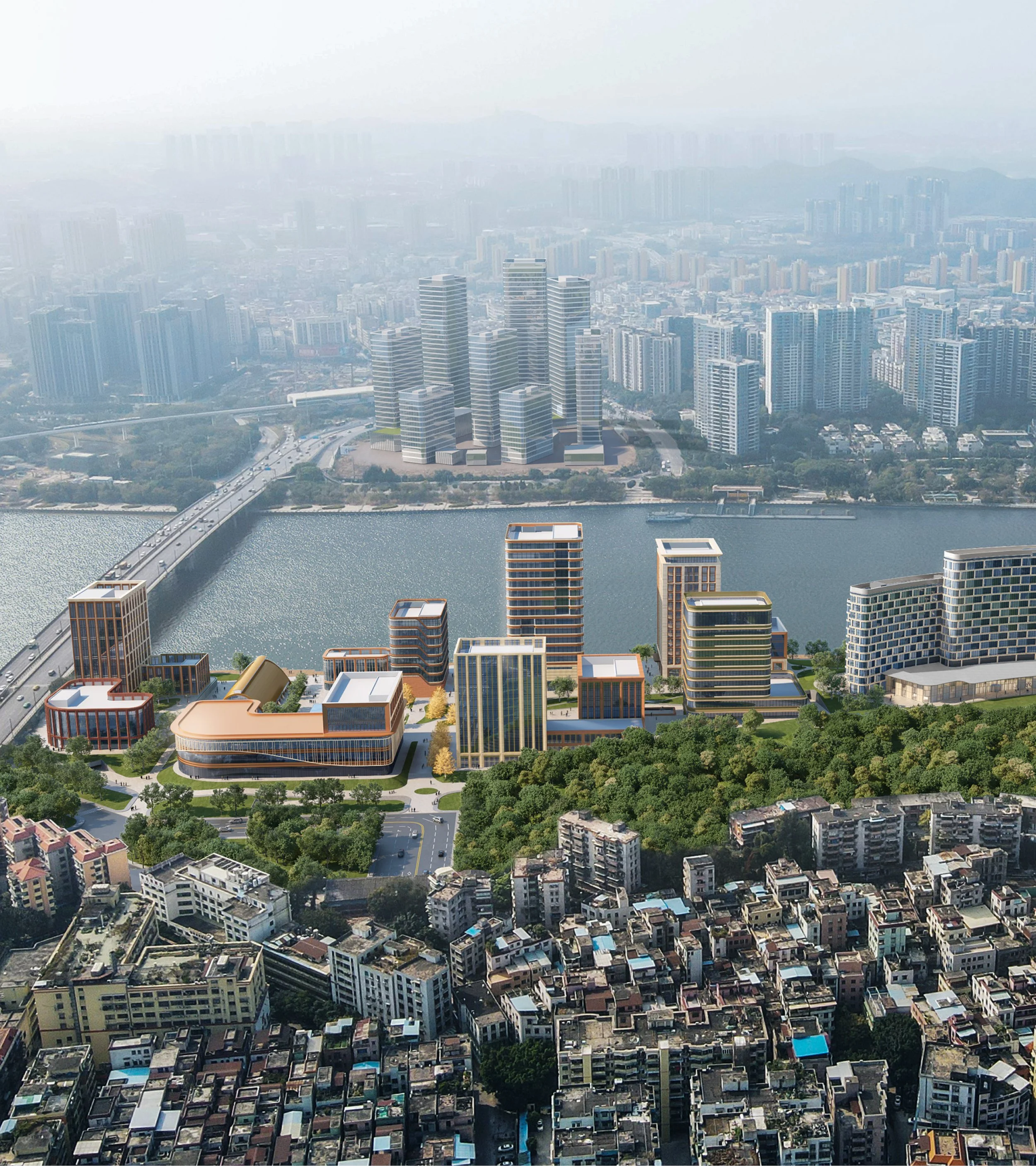 Organized around a central axis and sunken courtyard, the massing of the components alternates in height, proportion, and texture, forming a layered and varied 600-meter-long city skyline that emulates the client's ambition to regenerate the district. The riverfront park runs along the length of the development and connects to the conserved sugar factory and sunken courtyard, around which amenities such as a canteen, cafes, and exhibition facilities are located. The sunken courtyard also connects to the arrival axis and main entrance of the development.