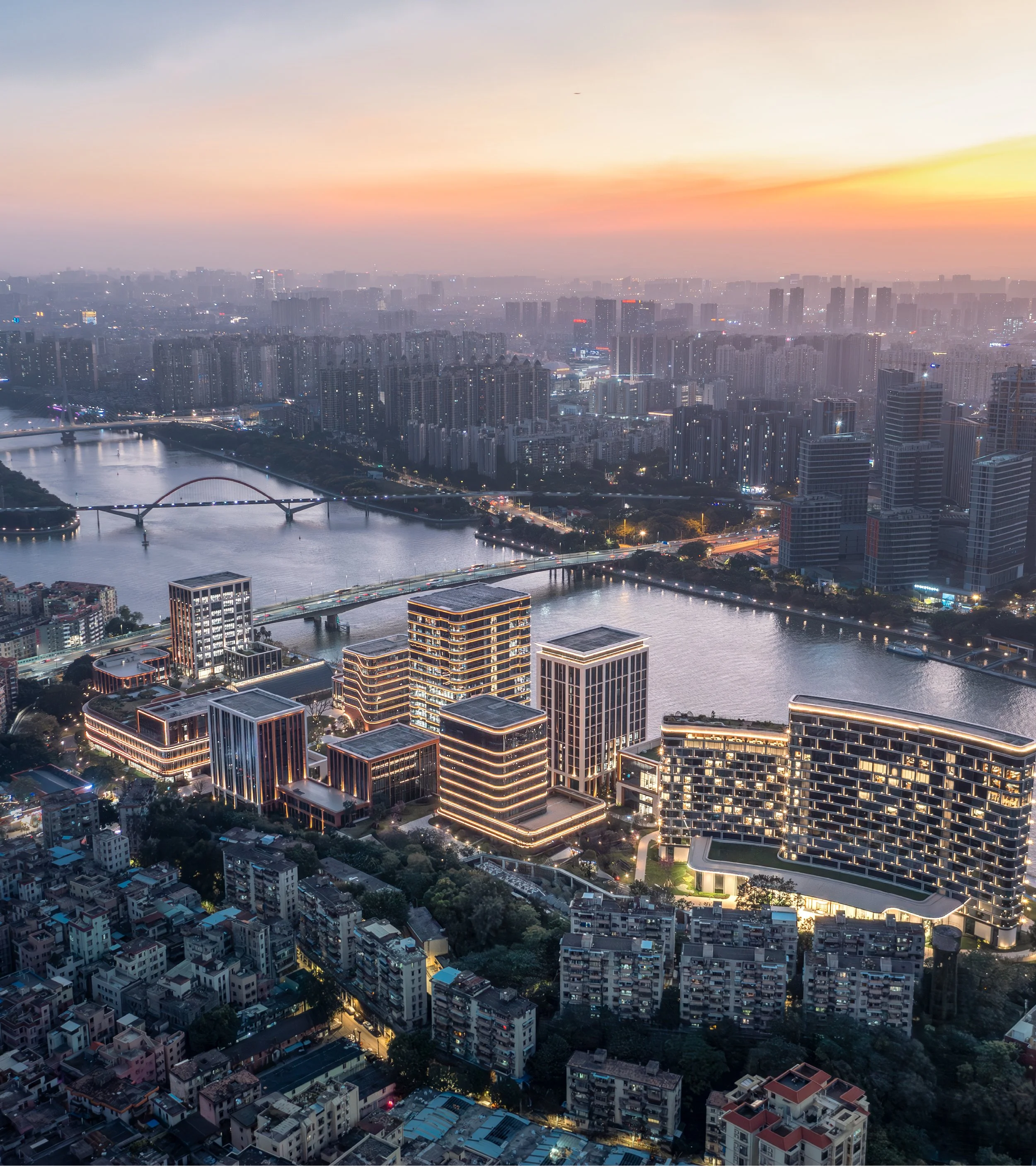 The Huawei R&D Campus in Guangzhou was conceived by SPARK Architects as a piece of city. Located along Songnan Road in Baiyun District, the 300,000 sqm mixed-use development transforms a former industrial riverfront site into an open, connected urban district where research, culture, landscape, and everyday life intersect.The campus comprises eight office buildings, one hotel, and an exhibition hall adapted from a former sugar factory, forming a diverse programme that integrates workspaces, hospitality, cultural functions, and public life. Buildings along the river create a layered skyline with heights reaching approximately 80 metres, while their placement defines a network of outdoor spaces that support movement, encounter, and pause.